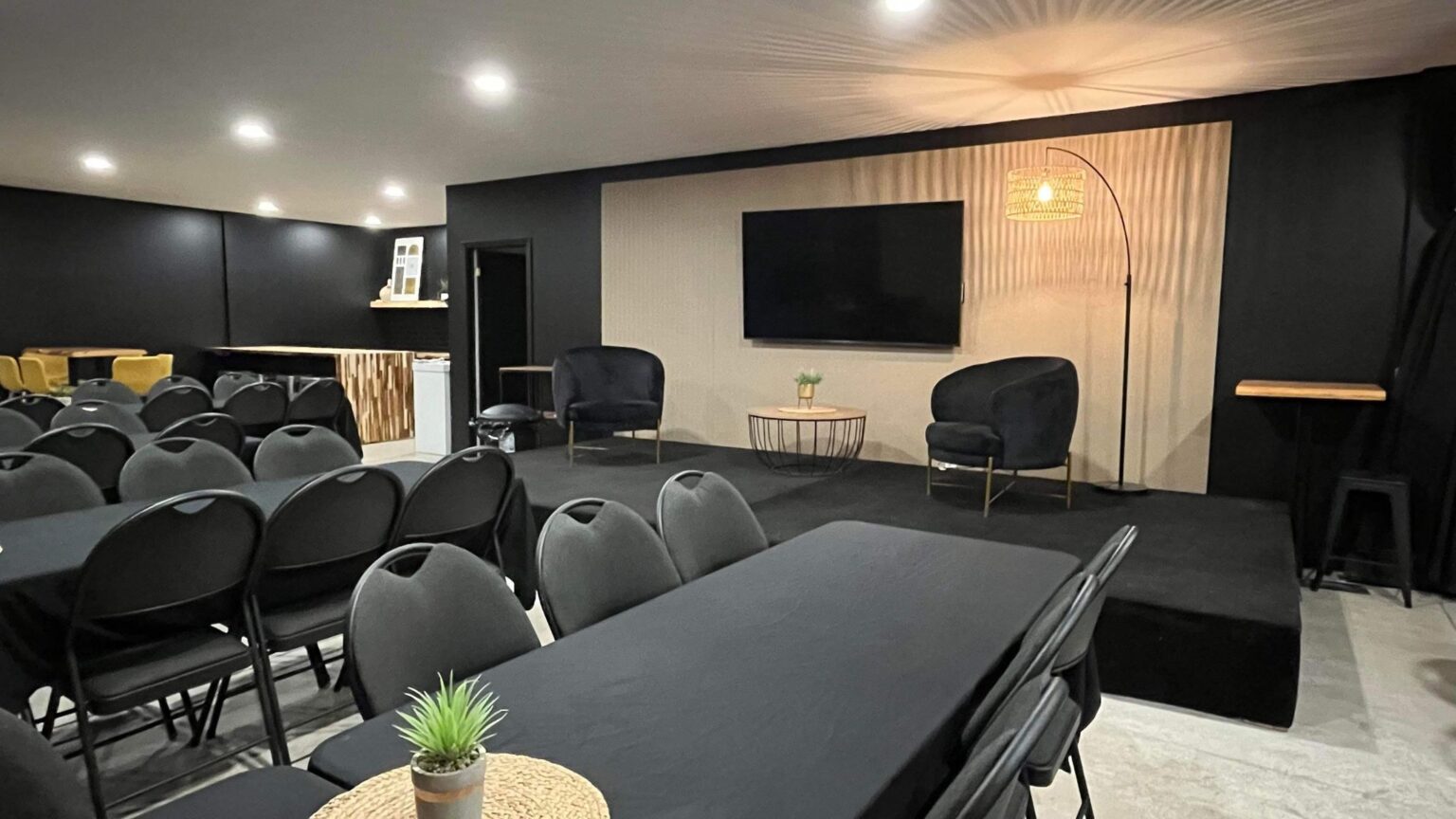 Conférences Fêtes Spectacles Activités corporatives Quelle que soit votre occasion, cette salle est idéale! Située au cœur de Chicoutimi, sur le boulevard Talbot, elle peut accueillir jusqu'à 120 personnes assises. C'est une des rares salles au Saguenay où vous pouvez apporter votre boisson. Le prix de la salle de réception est à la journée, donc vous pouvez y accéder aussi longtemps que vous le voulez. Nous offrons un service personnalisé avec un employé toujours présent pour répondre à vos besoins. Pour plus d'informations, contactez-nous ou demandez une soumission au bas de la page.
